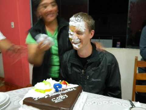 - Celebrated Cory’s birthday and had a delicious cake and an even better story of how the night went. So we finish eating a huge meal and remember that we have this giant cake waiting for us. So we get the cake out, put a candle on it, take lots of pictures, and sing happy birthday. Pretty normal right? Yes it was normal until the end of singing to Cory and then one of the ladies that cooks for us, who happens to be one of our ministry contacts, shoves Cory’s face into his cake!! Yes, this lady who is really little, very quiet, and just met us, shoves Cory’s face into his cake, IT WAS AWESOME! We all could not stop laughing at how hilarious and random it was for her to do that.