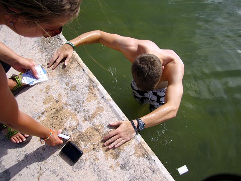 We sat there for about ten minutes and then the driver motioned to us that he was ready to leave. As I was standing-up, my wallet fell out of my pocket and into the canal. Before I left I bought a snap-shut, waterproof wallet so you would think everything was safe right? Well, I had too much cash to where it wouldn’t shut correctly so the entire wallet emptied as it fell into the water! As you can imagine, major panic ensued and so I took-off my shirt and jumped into the canal and started to gather all of my belongings. Thankfully, I was able to get it all back and nothing was lost. The only problem was that I forgot to take my cell phone out of my pocket before I jumped into the canal π So, my cell phone was out of commission and to add insult to injury I scraped my chest on the cement wall while exiting the water.
