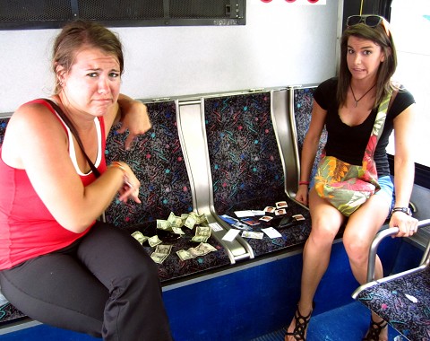 Linsey and Jessica helping air-out the contents of my wallet on the bus.