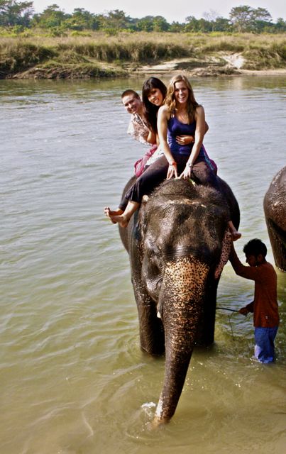 Me wearing a Nepalese suit / Me, Krystle, & Caroline on an elephant!