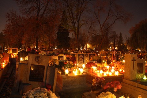 November 1st rolled around and most things in Poland were closed and ran on a Holiday schedule – it was All Saints Day. A Day to “remember” the lives of the dead. Candles and flowers marked the graves of loved ones. I was told that the candles burn for many hours, and are placed on the grave so that the departed souls can find their way “home” through the darkness.