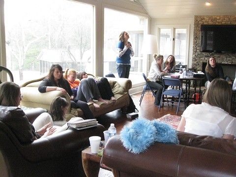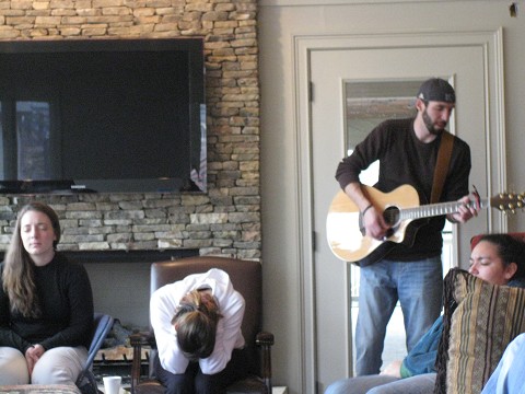 None of that happened this morning…infact the only thing i did between rolling out of bed (yes, i was late) and sitting in “church” was brushing my teeth and putting on a sweatshirt.  For us this morning church consisted of sitting in a living room.  On couches, on the floor, wedged in corners, laid out on the ground…where ever you thought you would be most confortable is where you landed.  It was informality at its finest!  Most were still wearing p.j.’s and no one had shoes on, but we were ready to worship and praise our Heavenly Father.