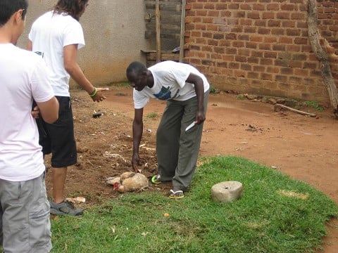 Michael – our trusty cook, guard, and friend – and Daniel are about to KILL THIS CHICKEN for our evening meal. Yup, it happened. I got this picture but couldn’t bear to watch the slaughter occur. Oh this is Africa. πŸ™‚