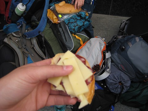 Salami and cheese with our massively large packs in the background. Mmmmm. 🙂