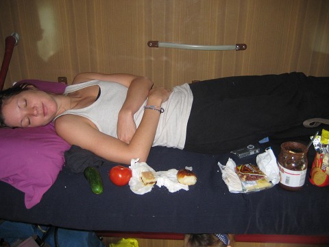 Brittany, Carin, Aly, and my leg – all enjoying our “manna” and the wonderful sleeper train!