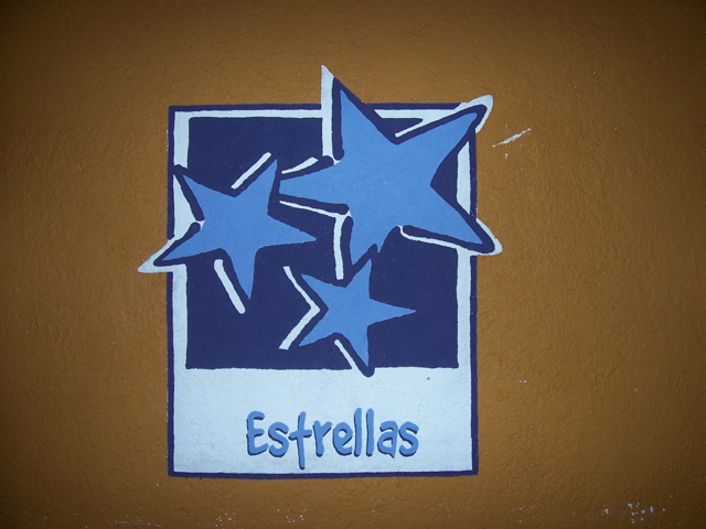 And… the rest of the story is that the pastor of Iglesia Del Camino liked the first mural so much that he asked for a second mural be painted for the girls.  I painted the mural for the girls club, “Club Estrellas” (or Stars Club in English) on Thursday and Friday of this past week.  Here is how it looked when I finished!  I had lots of good help beginning these murals.  I had to have help tracing them on the wall with pencils before I could paint. The little girls (ages 6-12) were so excited at church this morning when they arrived in their classroom and found their room had been decorated with their club name!