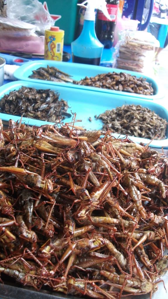 the grasshoppers and crickets. Nom told the vender to fry up some bugs for us