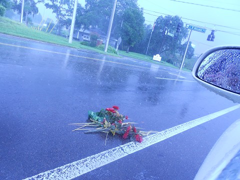 I spent the night before in tears … overwhelmed and feeling alone! I prayed to God to please help me, give me the optimism and faith I knew I was really capable of. Then the next day I reluctantly came out of seclusion to take care of some tasks. I was feeling a little better. I had received an email of encouragement from someone who was touched by my blogs. While I drove around I talked to God (like I always used to do.) Then on this day that well represented ( rainy & gray ) how I felt inside. I saw these red flowers laying in the middle of the road. How random! How strange! How metaphoric to how I felt!!
