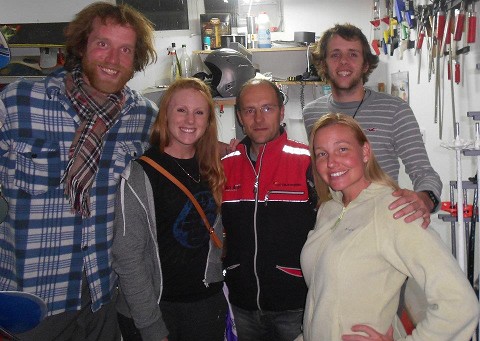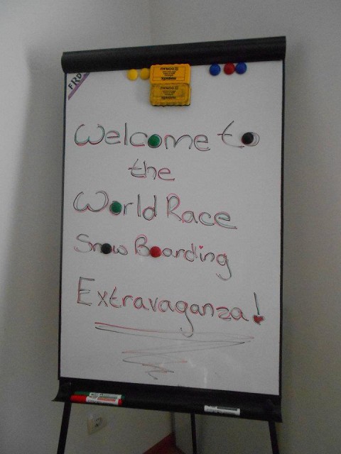 Excited to go the day before… I wrote on the board in our apartment. A pic of Kristen, Kevin, Tim, and I with the guy that hooked us up with all our snow boarding gear!