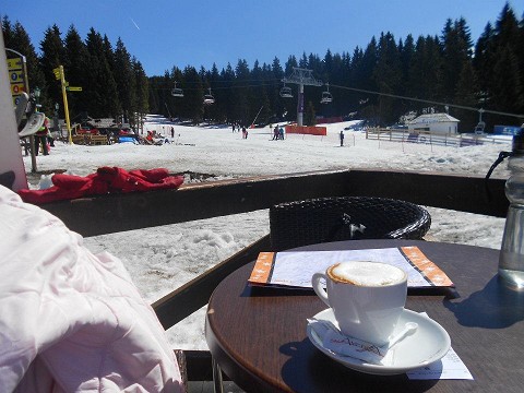 Kristen boarded with Kevin the rest of the way and Tim hung back for a few mins with me. Then I fell and was alone. I had to do this there was no one there to complain to now or feel sorry for me. I couldn't justify walking down. I told myself … Stop falling just stay on the board and GO!! I prayed again, probably out loud this time. "God, I'm so weak but I know with you I can do this!" Then a Serbian guy skied up to me and pulled me to my feet. I tried to apologize, feeling pathetic, saying "my first time!" He didn't understand English. He just lifted me up, smiled, and skied off. I had to wiggle my board to get it moving. The snow was super fluffy here and I was in a kind of a plain before the next decline. I took off and boarded for at least 100 feet … Wow, my longest run! Again I fell on purpose because I was too close to other people and didn't want to hit them. The snow was different here. I liked this snow soft and fluffy. Much better than the hard icey stuff I had been on. Falling didn't hurt as bad and I felt more in control of my board! Once there were no other skiers around me I stood up and just went for it. I boarded all the way down to the end of the slope where Kristen was waiting and cheering for me. Then as promised I took a cappuccino break and let the others go have fun.