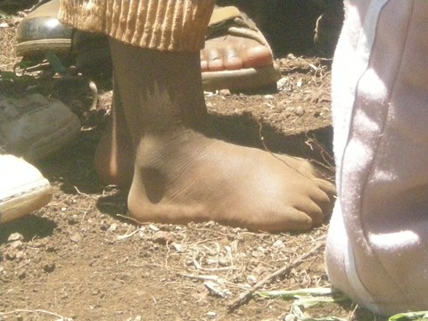 These children walk around the African bush with clothes that are never washed, most of them handed down to them from siblings or older children who have grown out of them. Their feet are covered in dirt, and many of them have infections from splinters or cuts and wounds that have never been taken care of. The ground they walk on is covered in 3 feet high grass, thorns that will pierce right through your shoes( I know this from experience), and sharp rocks that are hard to walk on WITH shoes much less WITHOUT them. And oh yes, their are snakes and other animals lurking in the bush that will strike at anything that walks by. Children in America would NEVER be allowed to play in these areas much less walk around in with absolutely no shoes on.