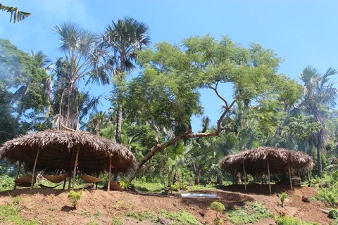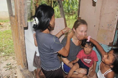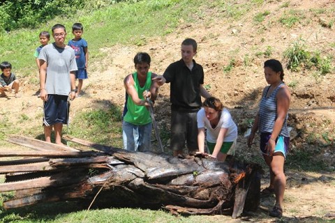 Day 33: We spent the morning clearing dead brush (which included several large tree trunks) away from the new huts. After lunch I fell asleep in a hammock and woke up to 3 boys laying on top of me. Ann Fell asleep with Mui Mui.