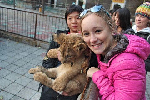 Day 52: Today Plum (one of the volunteers at Eagle’s Wings) took Matt, Dusty, Sara, Jen, and I to visit a TV studio. We got to meet several actors (who all wanted pictures with us) and we were even invited onto the set to watch a scene being filmed. We also got the opportunity to dress up in the costumes and take awesome pictures. After the studio we stopped at the zoo (which only has about 15 animals) and I got to pet a baby lion!