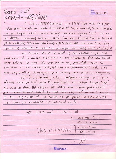 Merry Christmas and Happy New Year to all and same to Ate Sara, Ann, Raquel, and Kuya Francis and Peter. How are you all doing? We miss you all very much and also Arpaul is asking when you will be coming back to Aninuan so you can all play. I wanted to thank you for the true beautiful and nice friendship you all made with my son Arpaul.