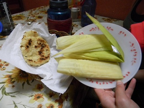 Or can he? Evidently there is MUCH more you can do with corn than just eat it on the cobb or creamed or on the side of a plate. Did you know that you can roast it, scrape it off the cobb, ground it and use that ground meal in a variety of ways? Clara, our ministry contact’s wife, helped teach us to cook it with sugar, butter, cream and a touch of salt. We used the same mixture spread flat between banana leaves then roasted them like flat pancakes over the stove. Then we spread the mixture into corn husks and rolled them up like burritos and placed them into a pot of water that we boiled over the stove.