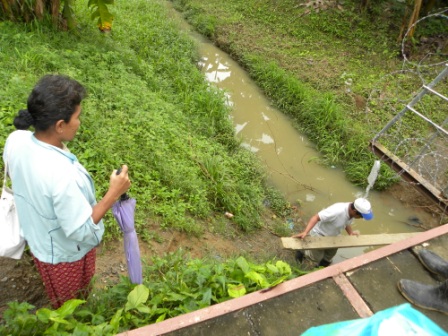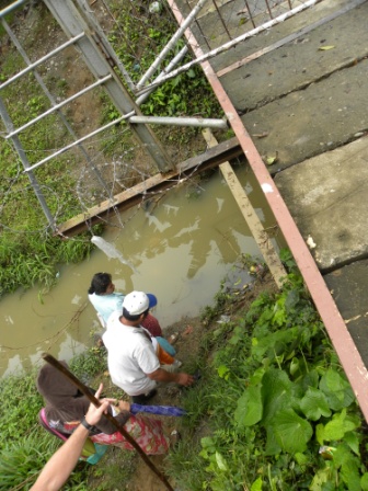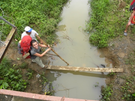 *Crossing the stream to enter the banana fields on only a small plank with our HEAVY packs on our back and hiking down and up slippery, muddy slopes to get to the plank. It was risky business, let me tell you. The gate to walk in was padlocked shut and surrounded by razor wire, so we found an alternate route to get the job done.
