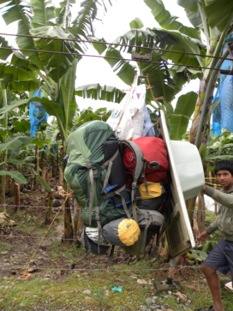 *Using banana cables to haul our packs and a porta potty (previously used…please note my pack is the red one…oh my) throuth the banana fields.
