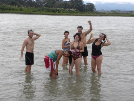 We have been to the jungle and back and it was much more than I thought it would be! We had the best of all worlds. We got to use our tents to keep out the bugs, but we got to do it inside a house of wood. We went ot the bathroom outdoors but there was a gigantic tarp like structure to provide some privacy and they brought in a seat of sorts for us. We ate off the fruit of the land and it was delicious! Fresh bananas, oragnes, plantains, yuka-delightful! We also had eggs, lentils and rice along with some delicious hot sauce and ketchup (yes, we brought in the condiments).