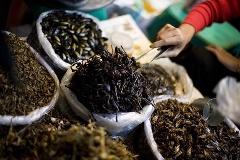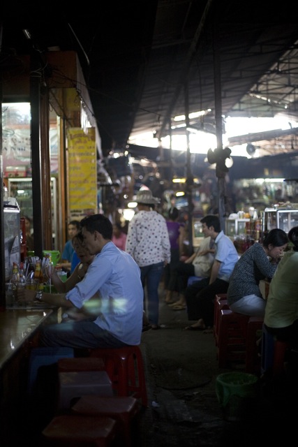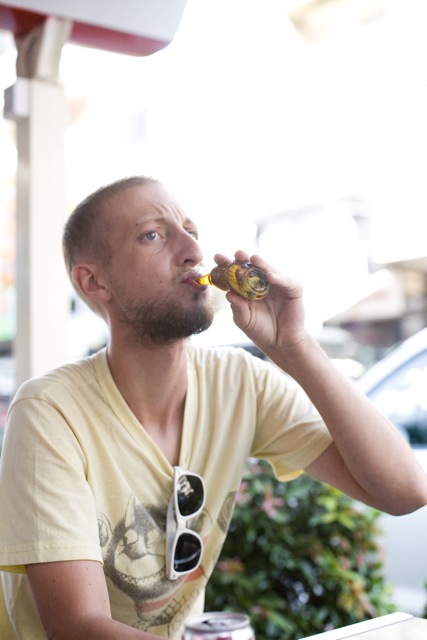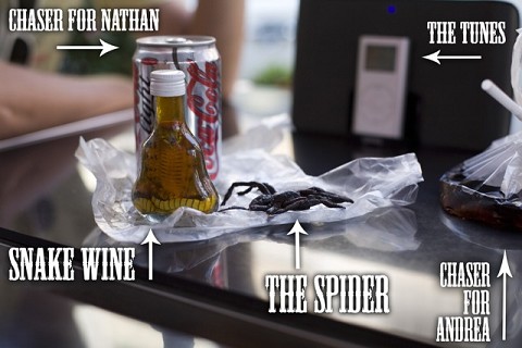 We also got a bottle of “Snake Wine”– it’s basically whiskey with a dead cobra floating in it. I really don’t understand the appeal, but Nathan and Andrea had to try it. So we picked out a spider, got a bottle of snake wine, and set up camp at an outdoor patio restaurant. This was the setup: