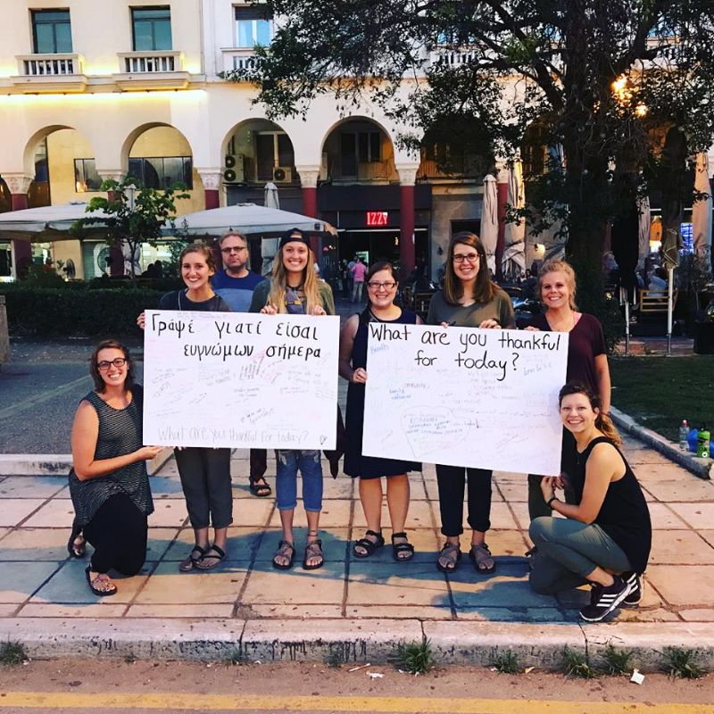 Today, we bought poster board and markers using the funds that people donated to us through our GoFundMe. With the help of our Greek friend George, we translated the question “What are you thankful for today?” into Greek and took the signs to Aristotle Square. As people walked by, we asked them to consider what they were thankful for and to write it on our boards (and to take a cookie while they were at it). We spent about an hour and a half talking to people and asking them about their lives, their families, and their passions. About 12 different languages are represented on our boards, including Greek, English, Romanian, Hebrew, Arabic, French, Italian, etc. We met a backpacker on a 5-year hitch-hiking expedition around the globe, a man named Alan who drew us a picture of his mom + house on the back of our board (and asked us to mail the picture back to his mom in Romania so she knows he’s alive and well in Greece), and a wide array of other folks finishing up their errands and business for the day. When people asked us why we were out holding signs, we were able to explain that we are thankful for a lot of things, but the thing that we’re most thankful for is Jesus Christ and the freedom from sin and death. Hopefully, those who passed by our signs were reminded of the incredible gifts that the Lord has given them, whether they acknowledge Him or not.