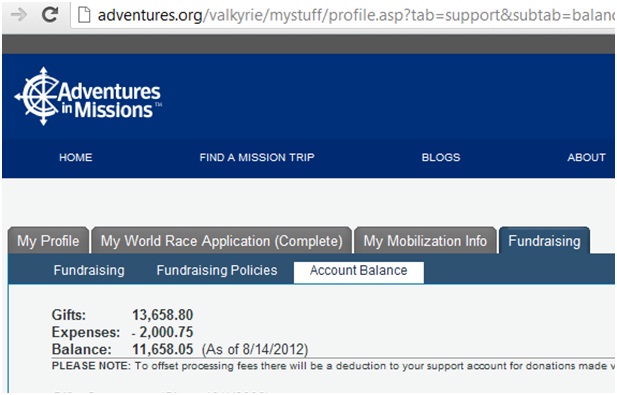 ***The reason for the top amount showing $13,658.05 is because in June 2010 I went to Haiti with Adventures in Missions and needed to raise $2,000. ***