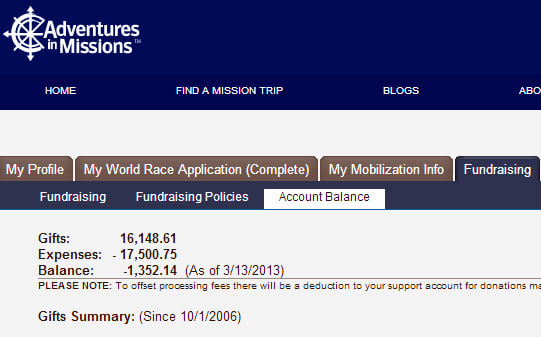 2010. My gifts show what money I have already raised towards the $17,500. My expenses