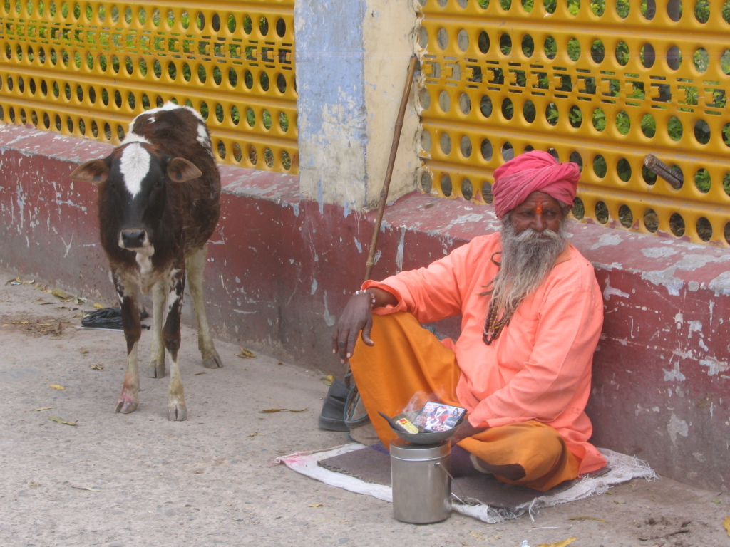 Lower Left: A Hindu with a Cow. Cows are still considered Gods in India; they even block busy streets at times. But, they still in practice aren’t given that much respect by most people.