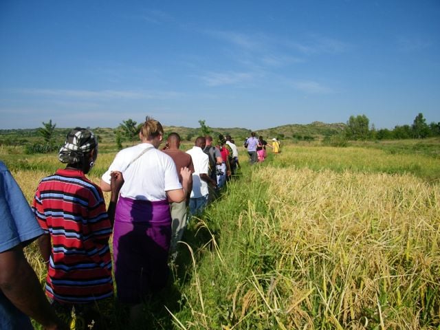 through rice fields, meadows, almost falling in mud ditches, and walking at