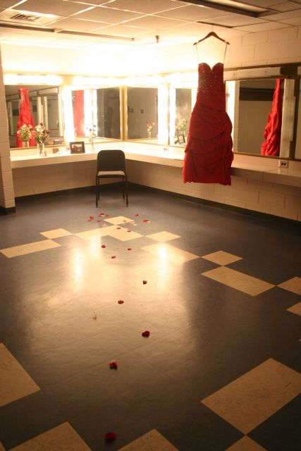 I arrived at the theatre around 8:10 and when I received a text from the manager that they had gotten their tickets and were in the auditorium I then got all the belongings, flowers, dress, (and ring) and met the manager at the side door and down the steps to the dressing room. During intermission and the second half of the concert, without Jennifer knowing I was there, I set up the dressing room with the dress hanging, photos, letters, and made a rose petal trail from the top of the steps to another staircase that would lead to the front of the stage.  When the concert was done, the manager and his stage quickly took down all things from the concert and rolled their best Steinway piano out to the front of the stage, and when I knew for sure the girls were gone I went out and laid the 16th rose, the music, a letter, and the last of the petal trail to the piano.  When all was set, I then texted her friend “Eckert” saying we were ready.