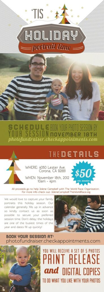 Funds-wise, I have a big Photo Shoot Fundraiser coming up on Sunday, November 18th. A few fantastic photographers have volunteered their time and talent and will be facilitating 20-minute photo shoots for family holiday pictures. They will then be editing and providing 5 digital images for these families. Check it out below.