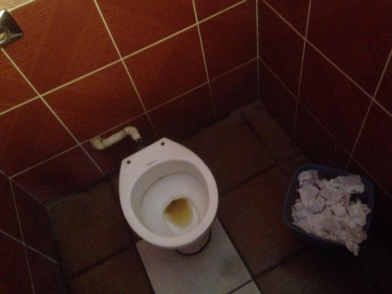 Sadly, I don’t have a picture to share, but this bathroom I used quickly in Peru is very similar. It just so happens that the stall I walked into had unflushed pee sitting in the toilet. The guy must have ran into the same problem I had. Wonderful isn’t it?! I later found out that to flush the toilet, you have to go outside of the stall and fill a bucket of water and pour it into the bowl. Now don’t I just look silly thinking you could push the lever to flush.