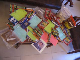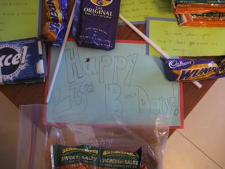 Then it was home to watch a few episodes of the office, 3rd season that Stacy already got me for my birthday, and for the enjoyment of the whole squad, who are we kidding Stacy? You basically bought it for yourself!!! Then this morning my teammates let me sleep in until 10am. Then I got out of the room and started finding notes all over the house from my friends on the race and things that they love about me, naturally there were too many notes to count. I smelled pancakes and we all sat down to enjoy a wonderful breakfast that Talia prepared with chocolate chips and nutella. Then the gifts started coming out, from Mom and Dad. Thank you so much for all the food, you did well with the smoked salmon and the chocolate covered raisins.