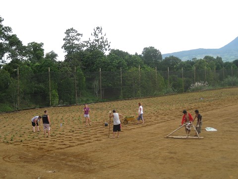 The process of planting a soccer field.  First, we removed weeds, rocks, a boulder, and other miscellaneous items.  Then sod was dug from a field nearby.  We dug holes, fertilized, and planted clumps of the grass.  One day it will be a beautiful field for the children to plan on as the grass spreads.