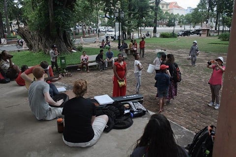 A few weeks went by and on our last Friday we received the opportunity to play in the area. We set up shop at pavilion walkway, right next to the giant snake. We only had a few people who could speak Khmer and all of them were prayer walking and looking for opportunities to talk to people in the area about Jesus. So, part of my team, and another missionary team from America started playing. We asked the Lord that his music, his sounds of joy and freedom, would minister to the souls of people. We asked the Lord that the vibrations of the music would cut through the chains of sexual slavery that these girls, boys, and women were shackled in.