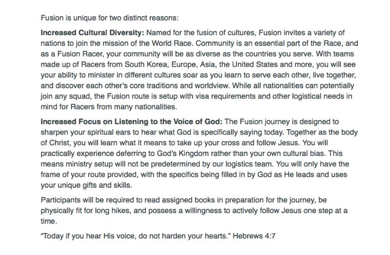 Yep! You read correctly. After much prayer and consideration, I’ve decided to switch over to the Fusion Route. I’m learning a lot about following God’s dreams rather than my own, and this has played a huge part in that. Since I applied for the World Race, I couldn’t get this Fusion Route out of my mind.. I have been asking God for guidance in these past few months, and I received an email a week ago that the Fusion Route needed more team members.