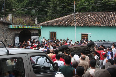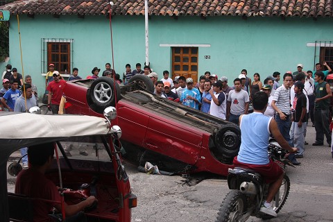 a sudden part of the mob flips the car over onto its roof. I begin to look around and notice the