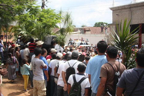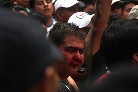 are hundreds of people surrounding these men beating them. The mob leader is standing on a car