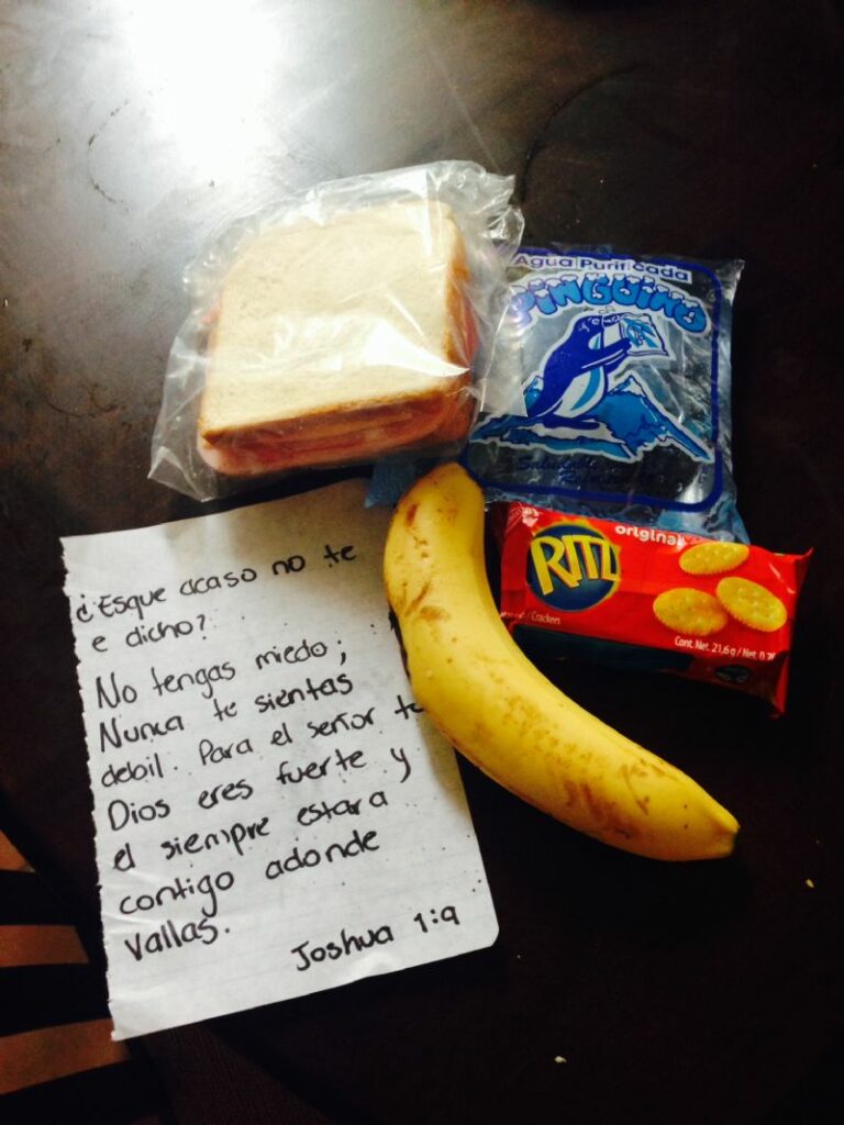 Coming home that night I was on fire to do more and to serve more. I talked to one of my squad leaders and asked him what else I could do. He simply said, “Josh if you want to go and feed the homeless then do it.” We went to the store that next day and got enough food to make 10 ham and cheese sandwiches. Along with the sandwiches we included crackers, a banana, and a bag of water. Lastly, I included one of my favorite bible verses, Joshua 1:9, in Spanish.