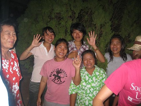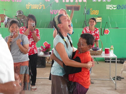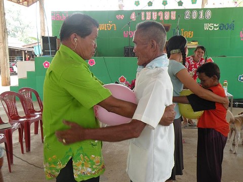 This family is filled with Joy and love. Pastor and Mum serves the leper colony that live behind their church. Their home is built on the same plot of land as the church which borders the leper colony. They have 3 girls who are staff: Mook, Buu and Aoi. They are in their late teens, and early 20s and they work very hard. Pastor wakes up at 4 each morning, praying and preparing for his daily prayer meeting with the elderly at 5:30 am. Mum wakes up for the meeting and then makes breakfast and delivers it to some of the elderlies who live on their own in the village. Once a month, they host an elderly session at church, we were so lucky to be a part of one this month while we were here. They plan games for these folks and let them know that they are not forgotten. Lunch is served after the games. No one leaves without having a good laugh or an empty stomach. This month, one of the games we played with them was to try to pop a water filled balloon between them and a partner.