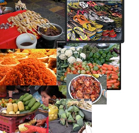 Dead chickens–and they did have live chickens that they would kill and pluck right there. Flip-flops. Dried shrimp. Familiar Vegetables. Pineapple–they cut it with a swirl to get rid of all the pokey things. Dried red peppers. Unfamiliar fruit.