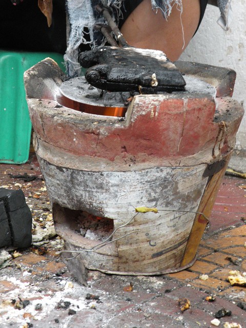 Here is the little griddle and fire that she cooks on…one waffle at a time. She is buttering up the griddle here.