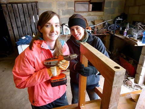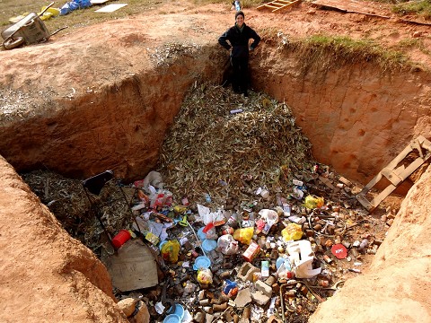 (Tiffany standing in the trash pit on the thousands (Kristen and Tiffany fixing tables for the school)