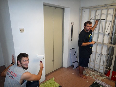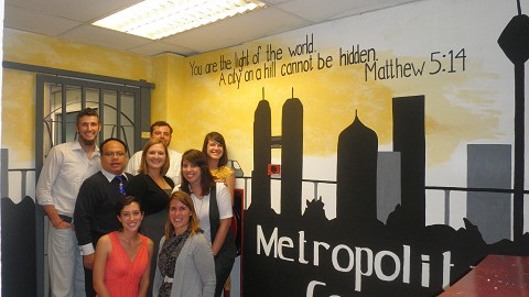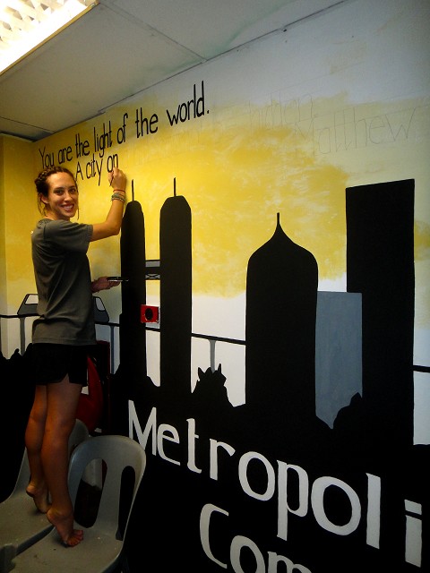 After asking the pastor if it would be ok to tear down the vampire wall it was decided that we would do something more. They had been praying and discussing a name for the church for the last year or so but where still unsure of what it would be. If at all possible we were going to be able to incorporate the new name into the mural. Pastor Edwin stated how they had been talking about the name Metropolitan Center. They wanted metropolitan due to their location and they really wanted to reach out to all the people in the city, both residents and people traveling through. After discussing it for a while it was decided that the new name would be Metropolitan Community! This would both represent the metropolitan area but be able to bring them together as the body of Christ and a community. So with the collaboration of our team and pastor Edwin we came up with an idea, sketched it out on paper, tore down the vampire wall, drew the mural on the wall, bought supplies, and started painting. We were able with the seven of us to finish the wall in two afternoons which was right in time for church Sunday morning. We joked that the people coming in for church would think they had come off the elevator on the wrong floor and be really confused. It was awesome that we were able to incorporate the new church name and the churches memory verse into the wall as well. Not to shabby for two days work.