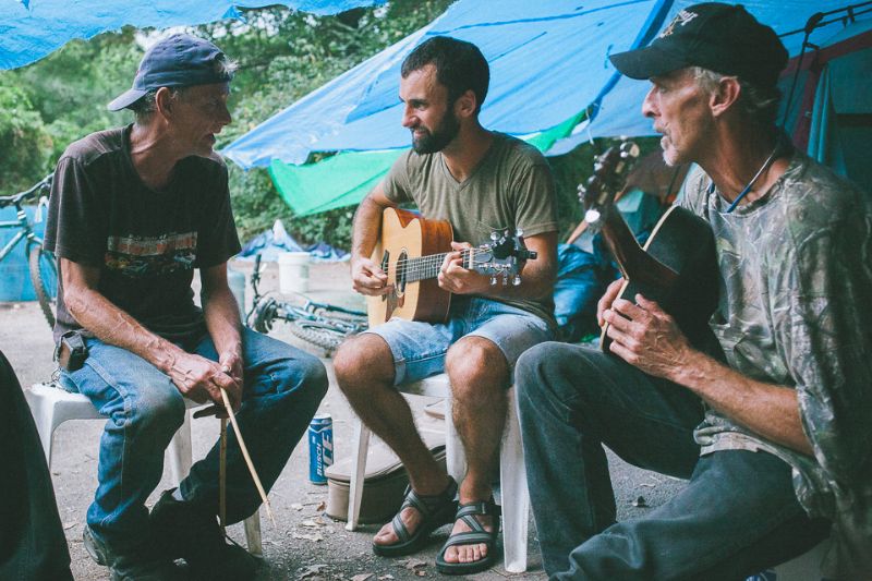 Mark and Super Dave are playing music. Mark has a harmonica in his mouth and a bamboo shoot in each hand. Using the bamboo like a pair of drumsticks, he smacks a string of small glass bowls on the ground. A hobo drum kit. Super Dave tinkers with his guitar while my friend Pat takes a seat and starts to tune. Pat’s one of the most talented worship musicians I know.