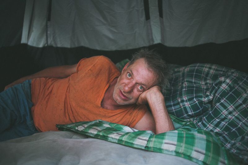 I unzip his tent to find him lying sideways, twisted up under a blanket. A plate full of disgusting old cigarette butts sits next to his air mattress. There are empty cups and dirty clothes strewn about, a mess. Jeff looks like he’s seen better days.
