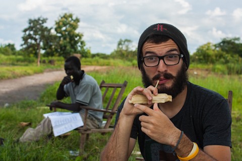 Travis eating some sugar cane before Bible study