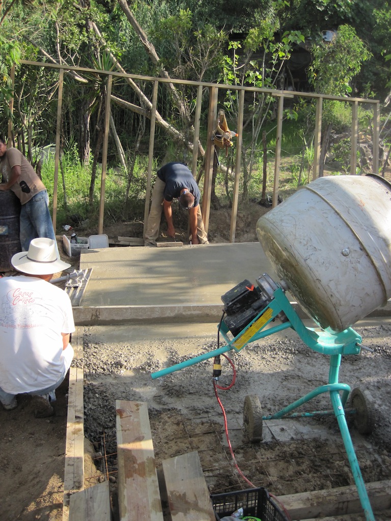 Our wonderful concrete mixer and about half way done with foundation. At the end of the day when the Guatemalans were perfecting our slab.
