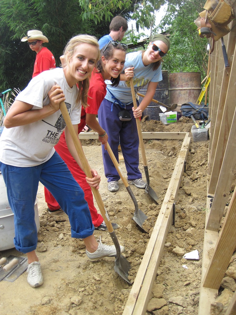 Our work day started by hiking about 1/2 a mile (it wasn’t a really long hike, but a hike never-the-less) to the work site with all of our tools and equipment.  Before we even began working on the house we had begun to sweat and get winded.  Our morning went slow at first.  We put together the walls of the house and did some prep work.  We all slowly found our place and began to work as a team early on.  The afternoon was definitely the hardest and most hectic part of the day.