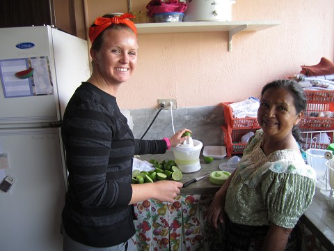 I have found myself helping out in the kitchen quite a bit which is pretty funny as I am no chef! It has been a fun, interesting, and challenging experience buying the groceries at the Despensa Familiar and market. Cooking for 65 people everyday for breakfast and dinner is another challenge in itself but it has been a learning experience for us all. I am thinking I should have learned some more cooking skills from my uncle before I left. Below are pictures of buying chicken from the carneceria and of Vacenta and I making some delicious homemade limeade with the limes that were picked from the lime tree in the garden.
