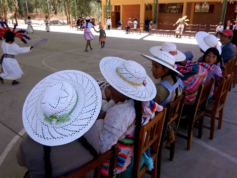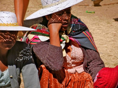 a large bustle underneath, a lacy short sleeved top, two perfect braids down the back with tassels on the end, a straw hat (usually white with fake flowers on the rim), and a large colorful blanket with a baby inside.